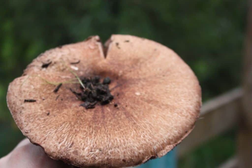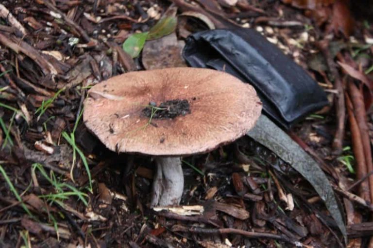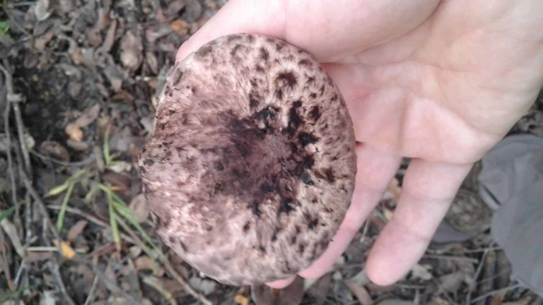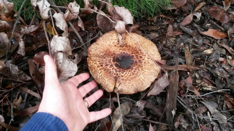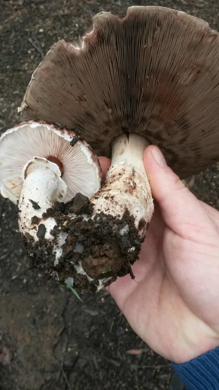 A frequent Agaricus that we find in both Pinus radiata and native forest in the southern Dandenongs, is a large, scaled cap species with brownish to purplish colouring, white to grey gills that turn chocolate brown with age, a thick stipe that can be spindle shaped, meaty and often worm-ridden. The largest specimen here was 19cms in diameter so quite large.